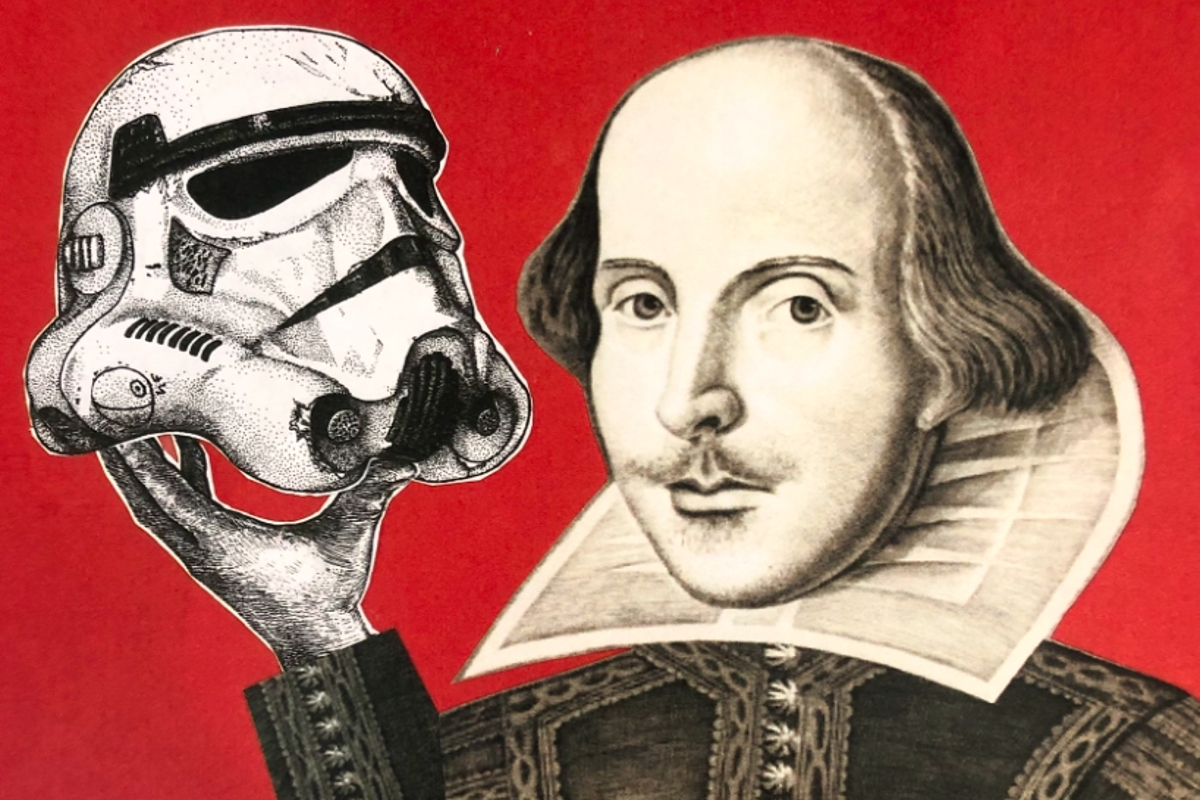 Well, I hammered out the first version of the show mixing characters together (Darth Vader + Claudius = Darthius), swapping out any sword play with plastic lightsabers, and tried to find the right blend of Shakespeare's quotable prose to clash with Lucas' technical jargon and equally quotable dialogue. I took notes on the shared similarities (evil father figures, talking ghosts, questioning if old friends can be trusted) and grappled with the differences (can Chewbacca be cast as a main character and still be understood?) My niece and nephews begged me to be a part of it and I spent weeks trying to decide if they could portray the visiting troupe of actors to present the play within a play. Should they be droids, Ewoks, or Jawas?