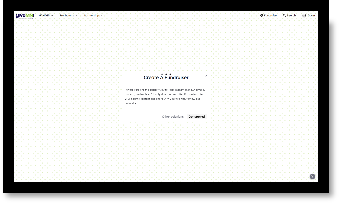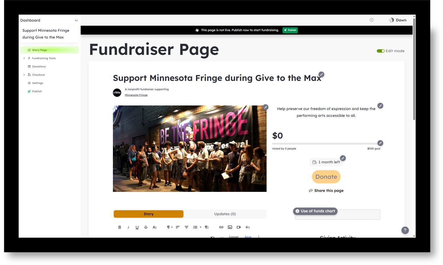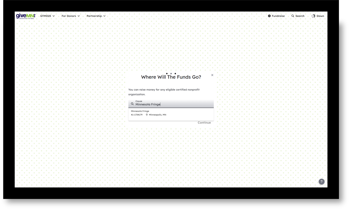 Step 3: Follow the prompts to create a fundraiser for Minnesota Fringe (EIN 41-1734179).