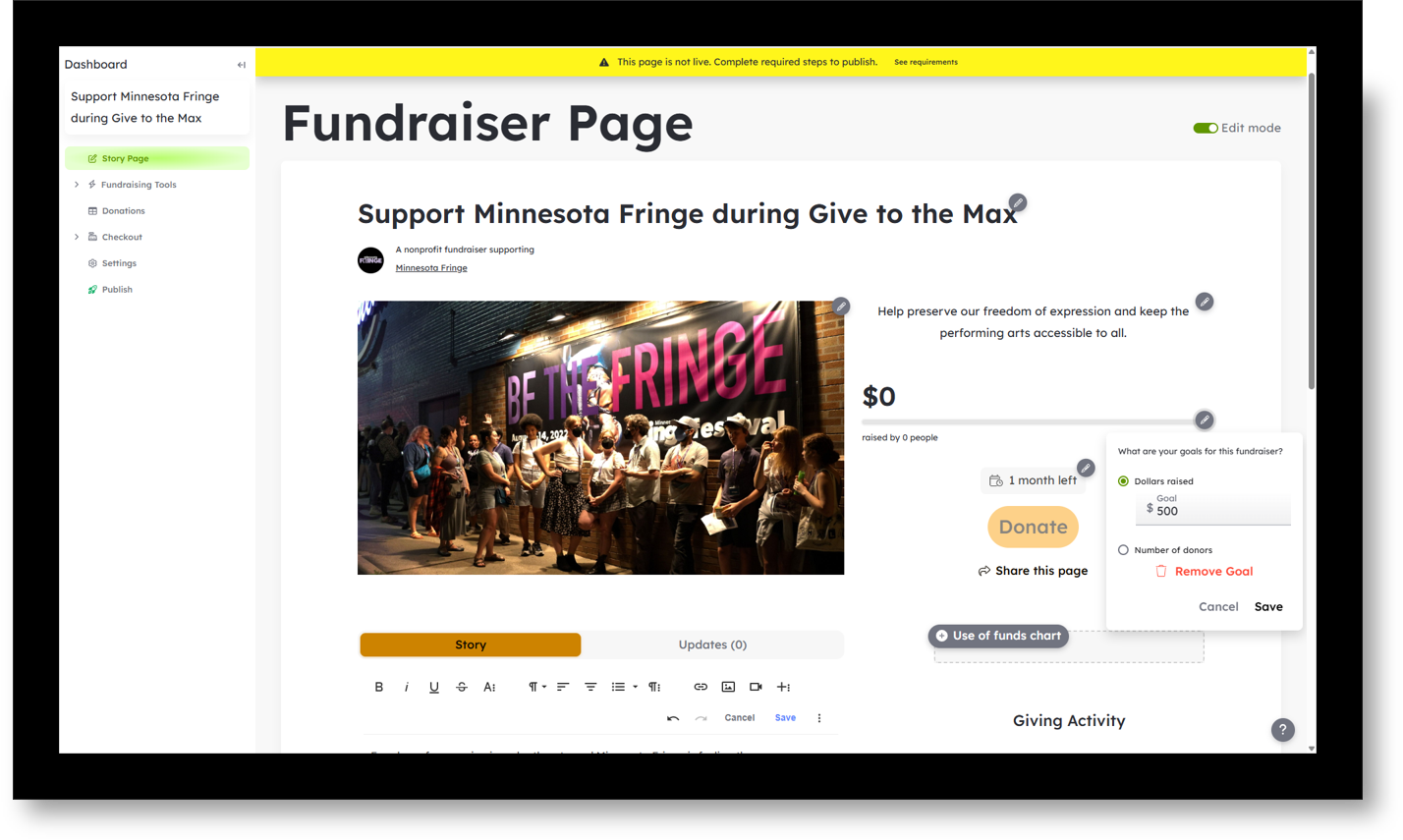 Step 4: Customize your fundraiser page to include a favorite photo, your personal story, a fundraising goal, and timing (Give to the Max Day is November 20, 2025). Save frequently so you don't lose your hard work!