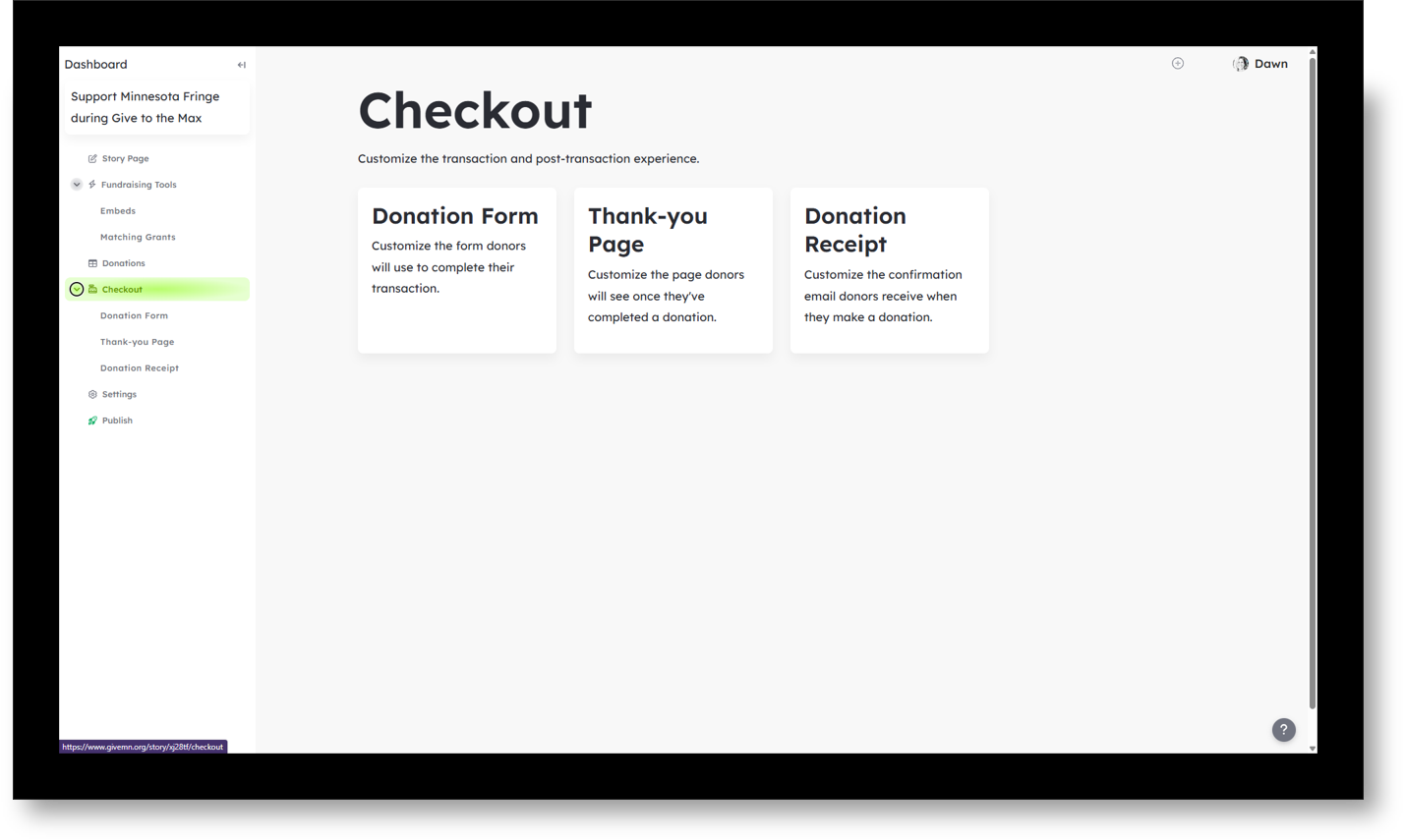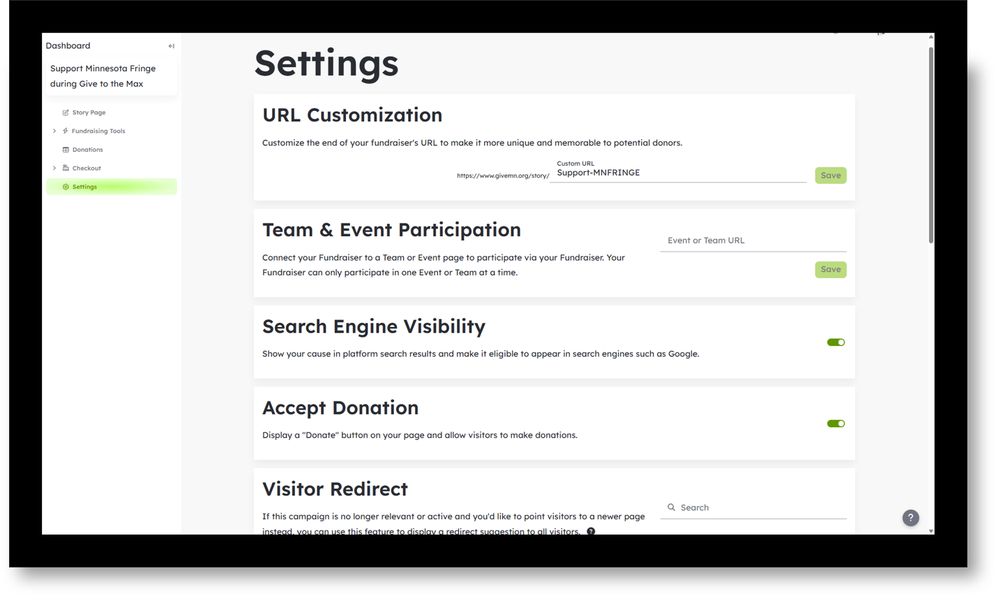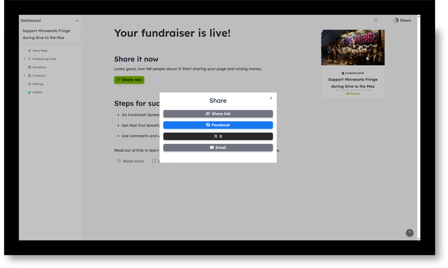 Optional Steps: You can tailor your fundraising to include additional Fundraising Tools for other platforms; create customized Donation Forms, Thank You Pages, and Receipts; set up a special URL, share on social media, and other details.